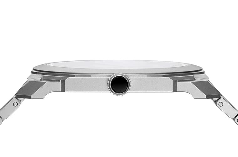 錶款遵循系列傳統以鈦金屬材質製成,並經由噴砂處理營造質感獨具的觸感與視覺感受,面盤的「鏡像」分割設計由中軸展開,朝著12個方位均衡切割,使得面盤穿梭在八角形與圓形的層疊構造中,強烈的對比感讓手錶經典雋永的設計美學從外觀一路延續至鏡面下方的面盤。