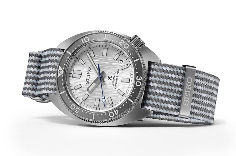 而錶款的「Save the Ocean」環保精神乃是體現在除了原廠配置的五節鍊帶外,隨著手錶另外附上的一條編織錶帶,錶帶的成分為100%寶特瓶再生原料,並結合日本傳統的「製紐(Seichu) 」編織技法製成,這種工藝常見於和服的繫腰繩,由於製作過程是將織紋編成袋狀,因此沒有截斷的切面,使得織物的韌性得以提升,符合現代潛水錶所需的要求。製紐技法製成的錶帶具有靈活性和透氣性,平時佩戴能夠讓人感受到優異的舒適性,且其外觀呈現出深灰與淺灰的交錯,剛好與手錶整體的色調相近,看起來相當合拍。