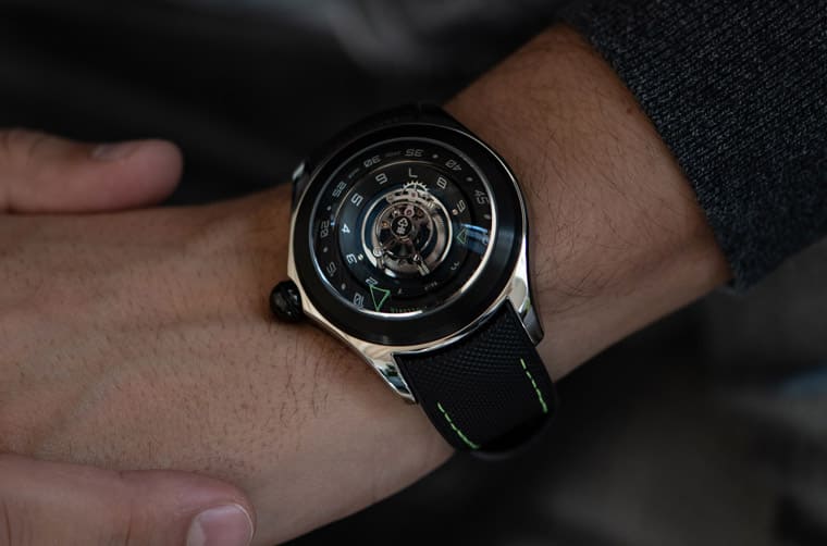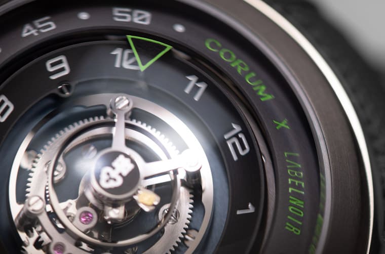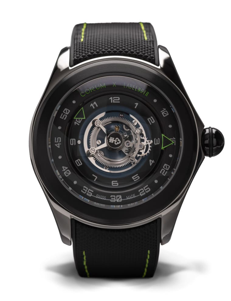 面盤外圍有一枚刻度環,正面印有螢光綠色的CORUM x LABEL NOIR字樣,以及0到60的刻度,搭配邊框同為螢光綠色的三角形指標,佩戴者可以藉此判讀出當前小時資訊。而再往陀飛輪靠近些還有零一枚刻度環,從上面的12個數字可知這是用來指示小時(也是要借助螢光綠色的三角形指標判讀),LABEL NOIR交替運用炭灰和淺灰色點綴手錶,而在灰色調的面盤上出現螢光綠色的指標,將能讓人一目了然當前時刻,至於在泡泡錶特色的拱形藍寶石水晶鏡面下,陀飛輪剛好就位在弧頂位置下方,無意間帶有點放大效果,讓人得以將陀飛輪的自轉動態看得更清楚。