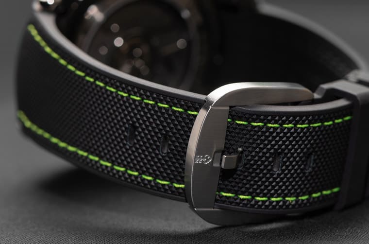 ▲黑色合成錶帶兩側縫線同為螢光綠色,呼應面盤細節配色。