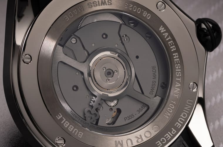 由LABEL NOIR操刀改造的Bubble 47中央陀飛輪整只錶以5級鈦金屬為主要材質,錶圈及錶冠以黑色ADLC (Anamorphous Diamond-Like Carbon)塗層處理,並採用霧面打磨營造視覺層次感。