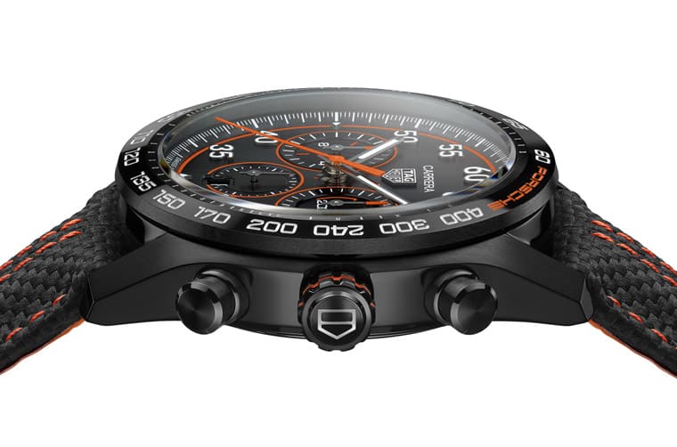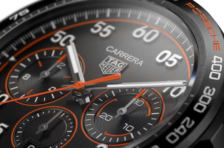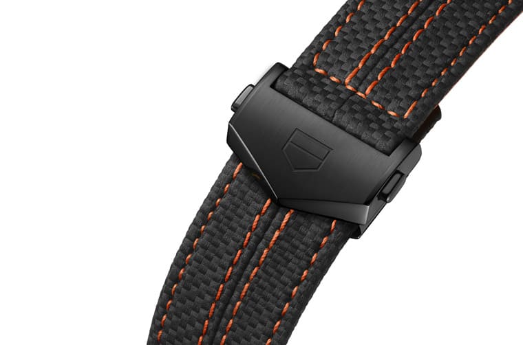 視線移至手錶面盤,其同樣以黑色為主要色調,並於表面加上垂直拉絲紋路,至於面盤邊緣分鐘刻度內側、三眼計時小錶盤外框乃至中央計時大秒針等處,皆再度點綴吸睛的橘色,在黑色面盤襯托下顯得格外耀眼。泰格豪雅表示採用橘色細節的靈感來自賽車在賽道上時,因為高速急駛摩擦導致激起火花的顏色,其也同時呼應速度的象徵——展現熱情如「火」的高速印象。