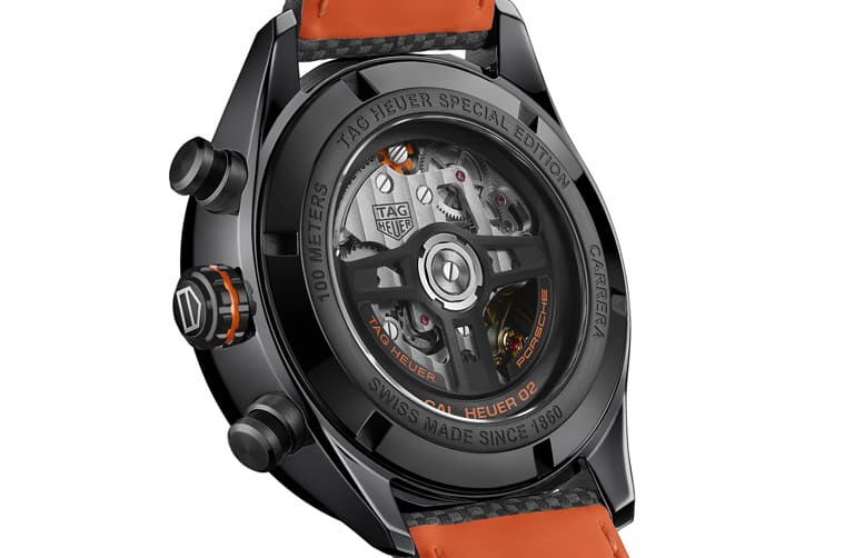 錶背採用透明底蓋大方露出手錶搭載的Heuer 02機芯,這枚機芯與Carrera系列計時碼錶宛如天生一對般讓人倍感熟悉,而且品牌也維持著保時捷聯名系列的特色,將機芯自動盤改造為狀似保時捷跑車方向盤的鍍黑鏤空造型,且自動盤上的TAG HEUER、PORSCHE以及機芯字樣也都塗上橘色呼應手錶整體設計,包括機芯內部的導柱輪零件也以橘色點綴,其與垂直離合機制共同負責操控計時功能,既能精準操作計時動作,也能避免計時功能剛啟動時,計時秒針可能產生的顫動情形,機芯的動力儲存達80小時,搭配手錶達到100米的防水性能,將賽車錶注重的運動機能與實用性推向高點,內外兼具的設計,強勢吸引賽車迷與錶迷的目光。