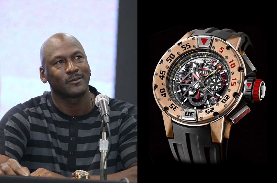 提到RM的手錶大家通常會先想到酒桶造型,不過JORDAN擁有的這款RM 032卻是圓形錶殼,而且它不僅外觀上看起來具備飛返計時功能等級的複雜度,還是一款通過ISO 6425標準、防水性能達到300米的專業潛水錶。有趣的是,這款錶的尺寸滿大的(50x17.8mm),但由於JORDAN也是有著6尺6寸(約198公分)的高大身材,所以手錶戴在他手上倒是滿剛好的。