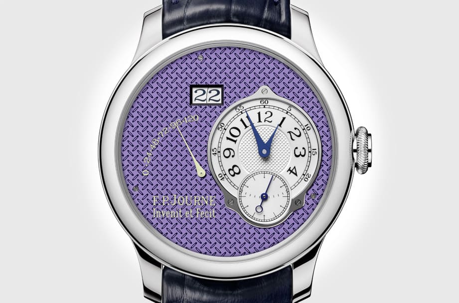 ▲Octa Automatique特別版採用鉑金材質製成,面盤格局為簡約的小三針加上動力儲存顯示,其中紫色的扭索飾紋為Action Innocence義拍款式獨有。