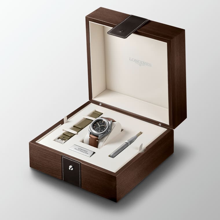 錶背實底蓋內部保護的是浪琴表現代機芯L893.6,這枚機芯內部含有矽游絲零件、動力儲存達72小時,走時精準度也會得瑞士天文台認證(COSC),無論品質與性能都讓人倍感安心。而在浪琴表替手錶打造的木質錶盒中,除了手錶與原廠配置的棕色皮革錶帶之外,還會附上一條以回收材質製成的卡其綠色NATO錶帶,讓錶主可以依自己喜好決定要搭配哪一條錶帶,從中也能變化手錶風格,達到一錶二用的效果。