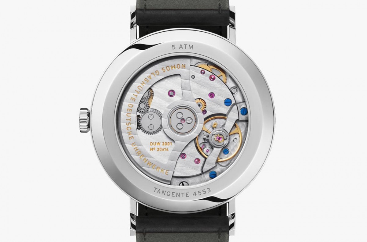 ▲透明底蓋下露出DUW 3001自動機芯,包括35mm與38.5mm款式皆搭載此枚機芯,從擒縱系統蘊含的回火藍色合金游絲可知其採用品牌專利的自制擒縱系統,展現NOMOS致力優化手錶性能的用心。