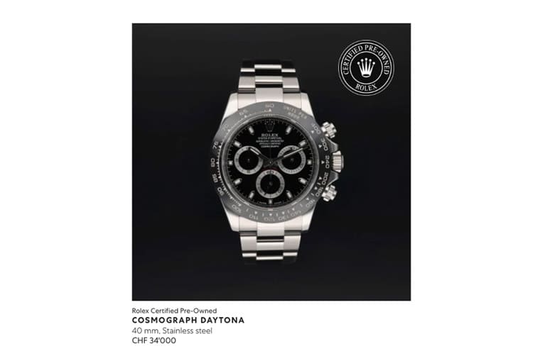 ▲目前寶齊萊官網的一款Daytona 116500原廠認證中古錶價格達34,000瑞郎,比起市場行情還要略高一些。