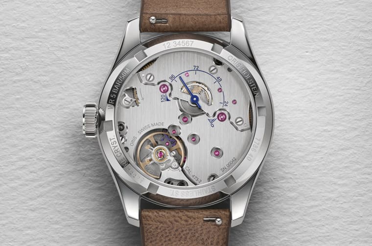 手錶透明底蓋下露出Calibre 473這個核心元素,回顧ORIS從2014年研發出近代首款自製機芯Calibre 110以來,一開始多數110家族機芯都是手動上鍊機制,直到2020年Calibre 400入列以後,品牌的自製機芯才逐漸出現自動上鍊機制,這次的Calibre 473再度回到ORIS十年前重啟自製機芯項目時主要採取的手上鍊機制,從機芯規格與名稱看來,可以簡單理解它是400系機芯的手上鍊版本,包括五日動力儲存、10年保固與建議10年保養一次的週期等等都不變,品牌也因應上鍊系統變更,而特別在錶背設置動力儲存顯示,讓佩戴者更能即時掌握動力消長情況。