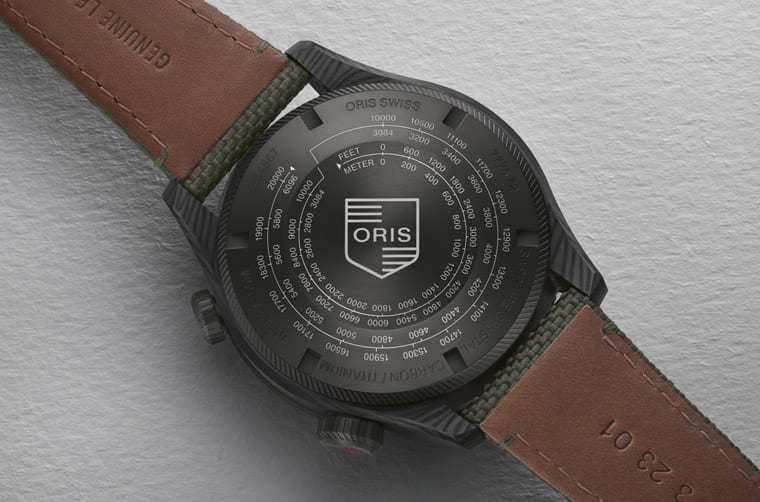 最後看到的ORIS新作為ProPilot Altimeter高度測量錶,這款錶擁有領先全球自動錶首創的機械測高儀,ORIS最初於2014年研發出這款作品,2023年錶款改採由蘇黎世聯邦理工學院所研發的獨特碳纖維複合材質重新出發,其以3D列印而成的錶殼除了能將厚度減少1mm,重量更一舉輕盈達70克,對於錶徑達47mm的ProPilot Altimeter高度測量錶而言,這減少的厚度與重量,絕對是能提升佩戴舒適度的重要關鍵。