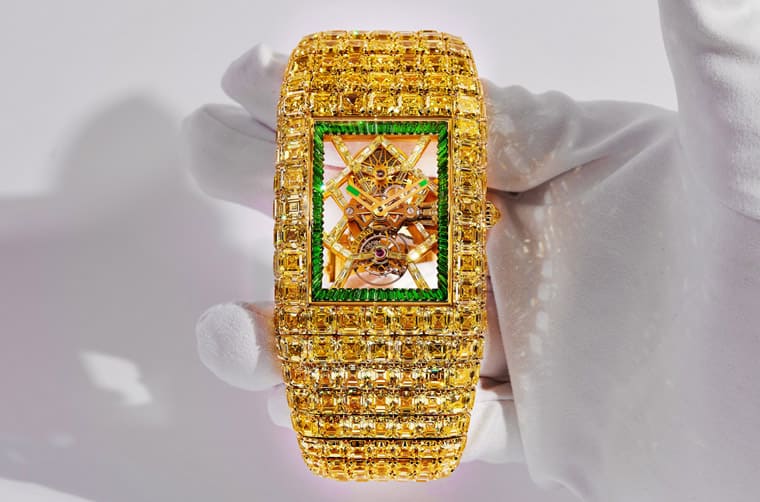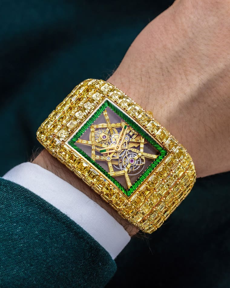 18K黄金材質/JCAM39手動上鍊機芯/時、分顯示/陀飛輪裝置/錶款鑲黃色鑽石482顆,約重216.89克拉、沙弗萊石76顆,約重3.59克拉/藍寶石水晶鏡面、透明底蓋/防水30米/錶徑52.2x43.5mm/限量1只/參考價:US$ 20,000,000
