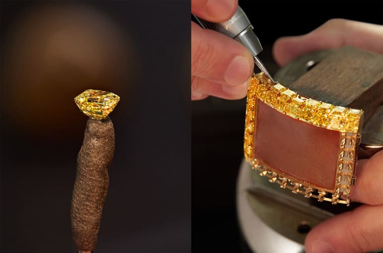 ▲品牌花費好幾年的時間收集製錶需要用到的黃色鑽石,最終將其切割出400多顆,約重217克拉,全數鑲在手錶的錶殼、鍊帶與面盤上。