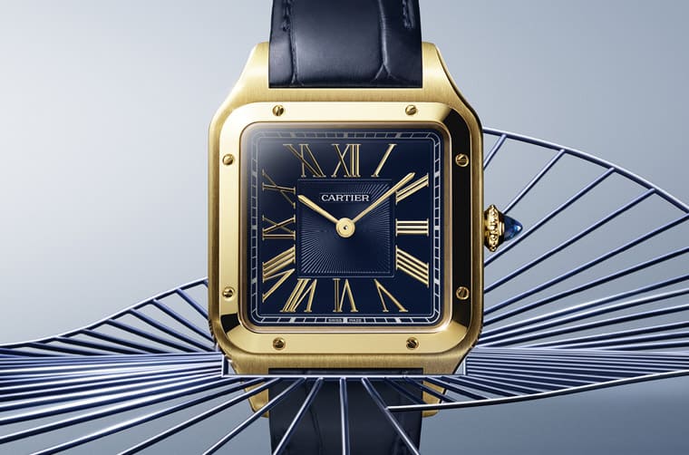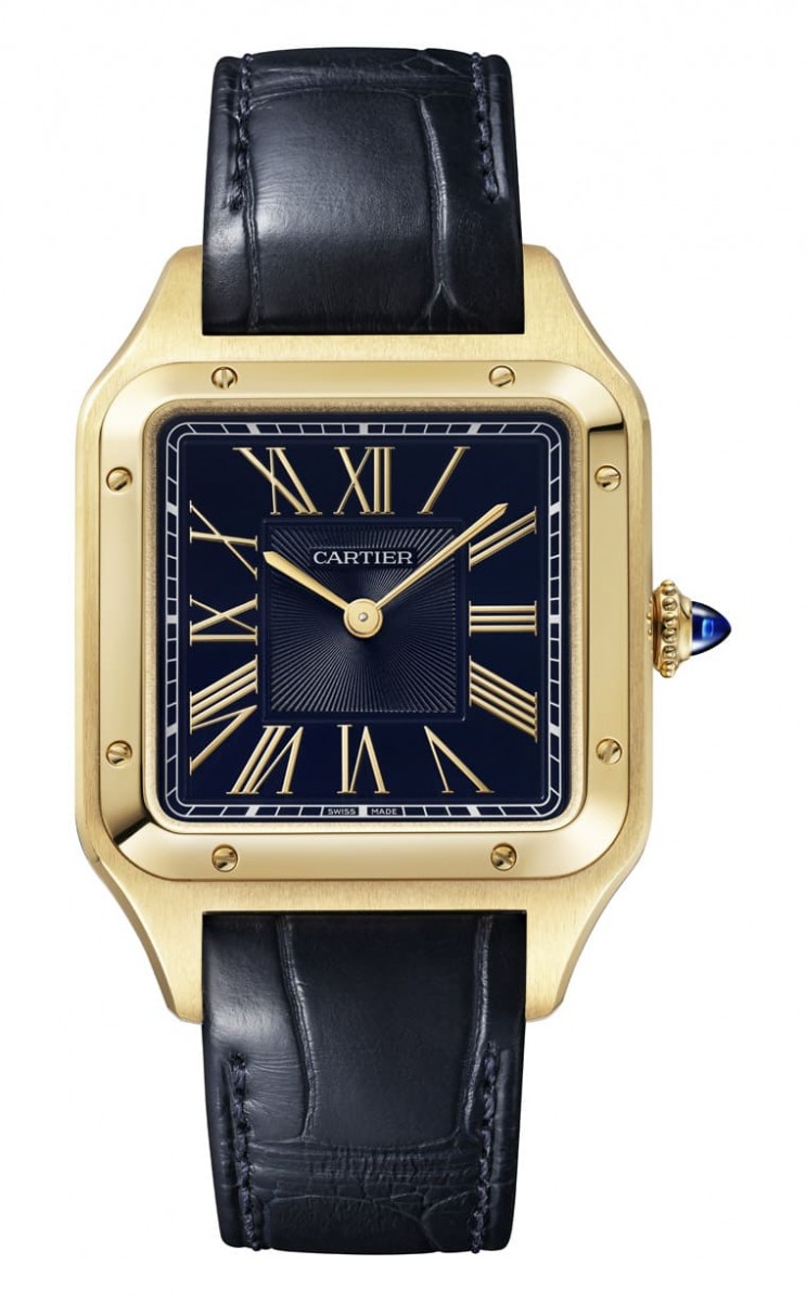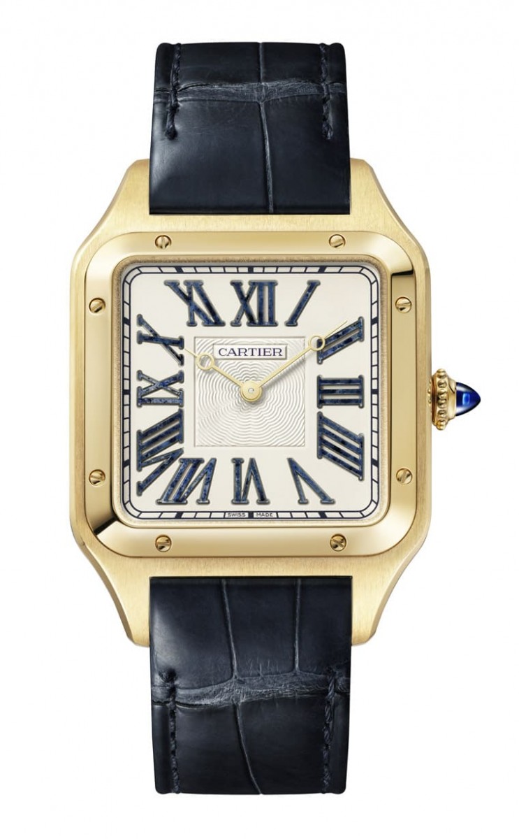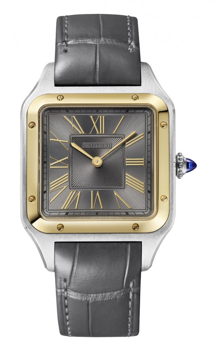 Santos-Dumont系列另外推出兩款搭載石英機芯的大型款,一款為不鏽鋼錶殼搭配黃金錶圈,另一款則是黃金錶圈,前者配置的是灰色緞面放射狀太陽紋面盤、後者則是搭配海軍藍色緞面放射狀太陽紋面盤,包括錶帶也都與面盤同色調,至於面盤上的羅馬數字時標以及指針都是金色系,展現與Santos陽光豪邁風格有別的雋永雅緻風格。