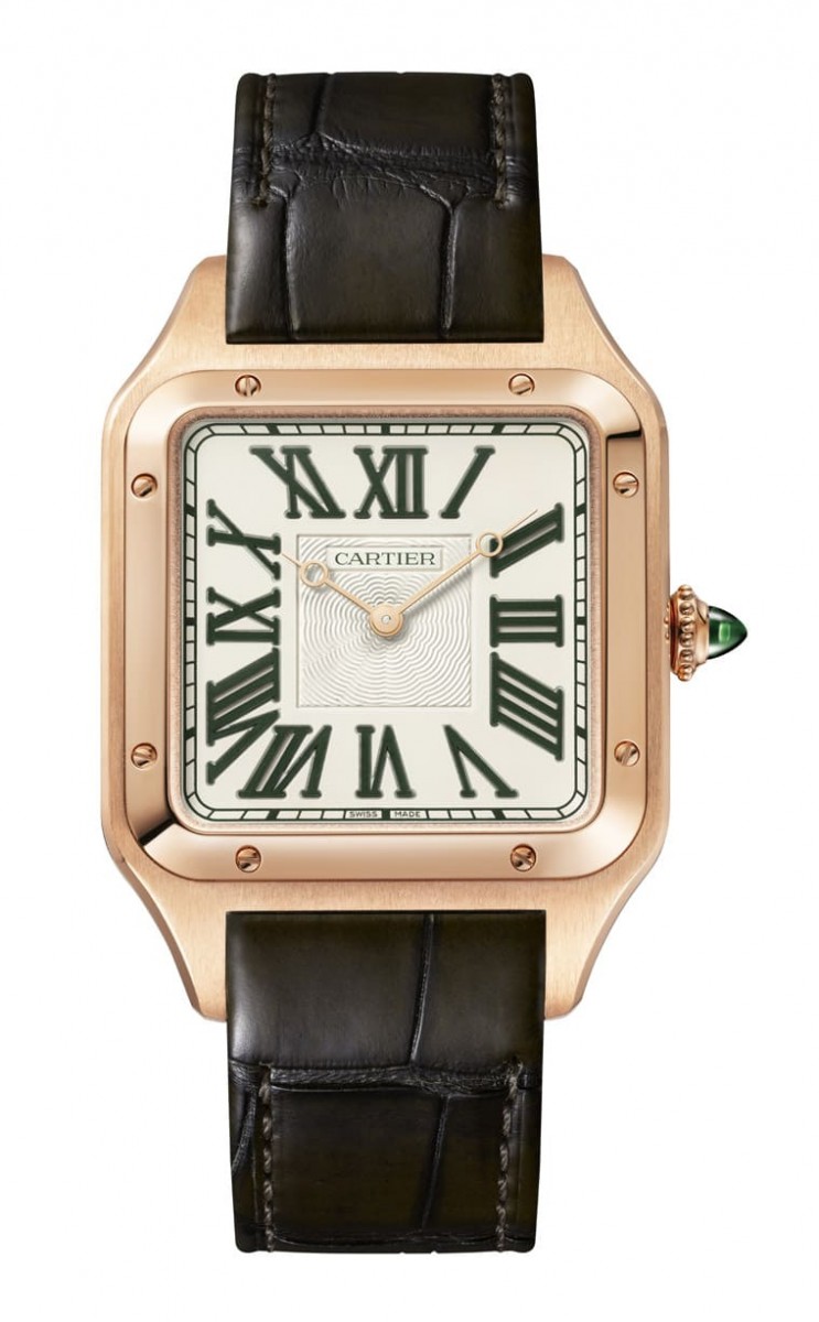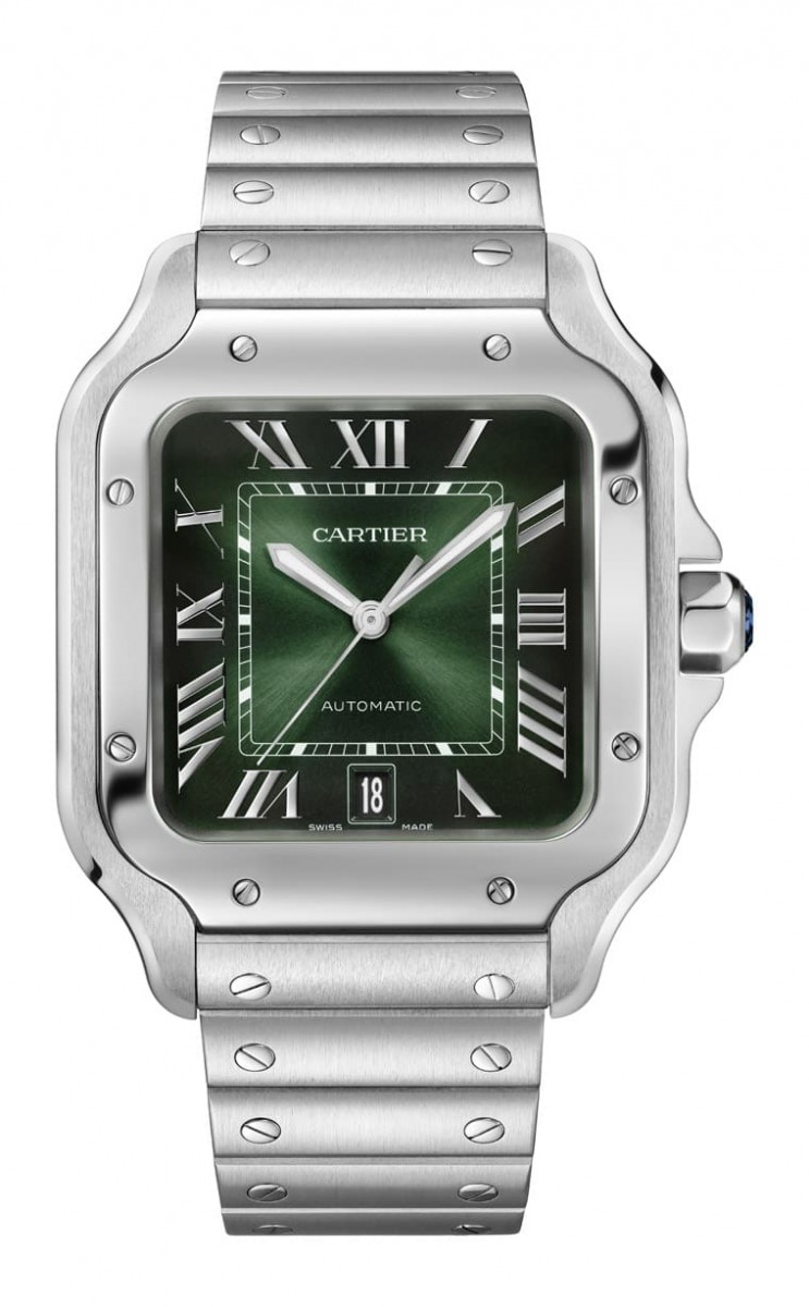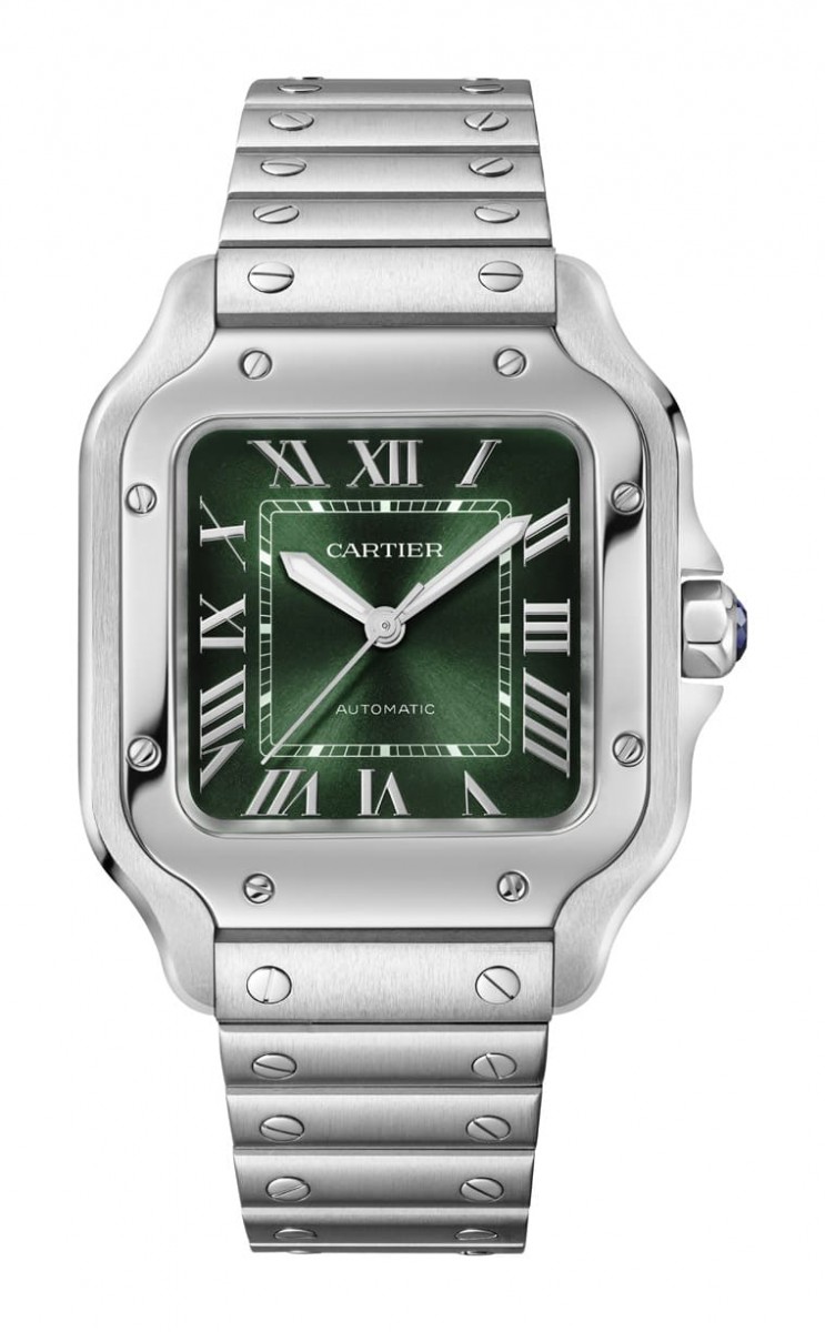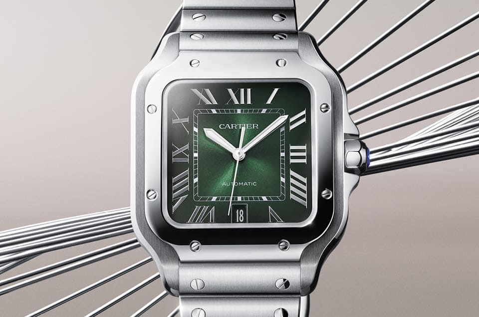 卡地亞2023年繼青金石藍色面盤後,新開發出綠色面盤的Santos手錶,綠面Santos手錶呈現細膩漸變色彩(面盤由中央往四邊呈現綠-黑的漸層效果),並散發金屬感光芒,能隨著光線照射以及手腕角度變化呈現豐富的光影魅力。品牌在製作過程中是在金屬面盤覆上一層綠色真漆,搭配放射狀太陽紋修飾後,塑造出手錶搶眼的視覺彩度。