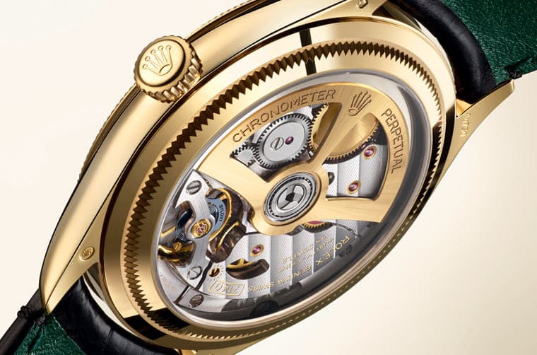 Cellini系列當初採用實底蓋設計對於某些玩家而言略感可惜,認為此舉少了些賞玩性,1908系列顯然有收到市場的回應,所以別開生面地採用透明底蓋設計,露出推動手錶小三針功能的7140自動機芯。若與Cellini Time搭載的3132機芯相較,7140機芯引進許多品牌近年的製錶成果,包括Syloxi矽游絲、Chronergy擒縱系統等,而且其自動盤一律由18K黃金製成,並經過鏤空處理,裡面改用改良滾珠軸承以提升整體運作效率,同樣讓人有感的還包含機芯的動力儲存,想當年3132機芯的動力儲存僅48小時,以現今標準稍微差強人意了些,因此7140機芯直接將動力儲存提升至66小時,多出來的時間無形中也強化了手錶的佩戴實用性。佩戴者藉由透背可欣賞到鏤空的K金自動盤,還會注意到機芯底板也多了日內瓦波紋修飾,提升了勞力士機芯之前較為人詬病的修飾較簡潔的不足之處,即使和高端品牌以手工精修的水準還是有距離,但至少已經變得更賞心悅目,不會讓透明底蓋設計淪為只是為了露出機芯的目的,還是能讓人從中感受品牌的作工水準。