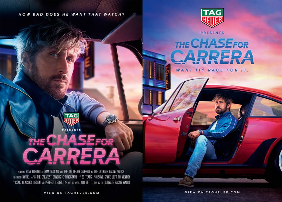 《The Chase for Carrera》蘊含多重電影風格,例如從緊張刺激的追逐片,到脫口秀喜劇、幫派片、西部片,然後又再度回到追逐片,大概五分多鐘的片長顯得十分緊湊。片中不僅可以看到萊恩.葛斯林戴著藍色Carrera Glassbox拱形計時碼錶並開著紅色的保時捷Carrera到處趴趴走,就連凡妮莎.拜爾飾演的道具師手上也戴了2023年泰格豪雅引起錶迷注意的亮粉色Carrera日期36毫米自動錶,兩人進行激烈的飛車追逐,相較於萊恩.葛斯林開著保時捷跑車一路狂奔,原本只是拔腿狂奔的凡妮莎.拜爾過程中陸續駕駛重型貨車甚至高爾夫球車在後追趕,精彩的橋段真的一度讓人以為自已在看一場喜劇動作片。
