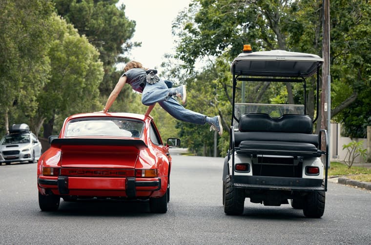 ▲微電影帶有動作喜劇效果,因此可見凡妮莎.拜爾駕駛著高爾夫球車飛車追逐保時捷的場面。