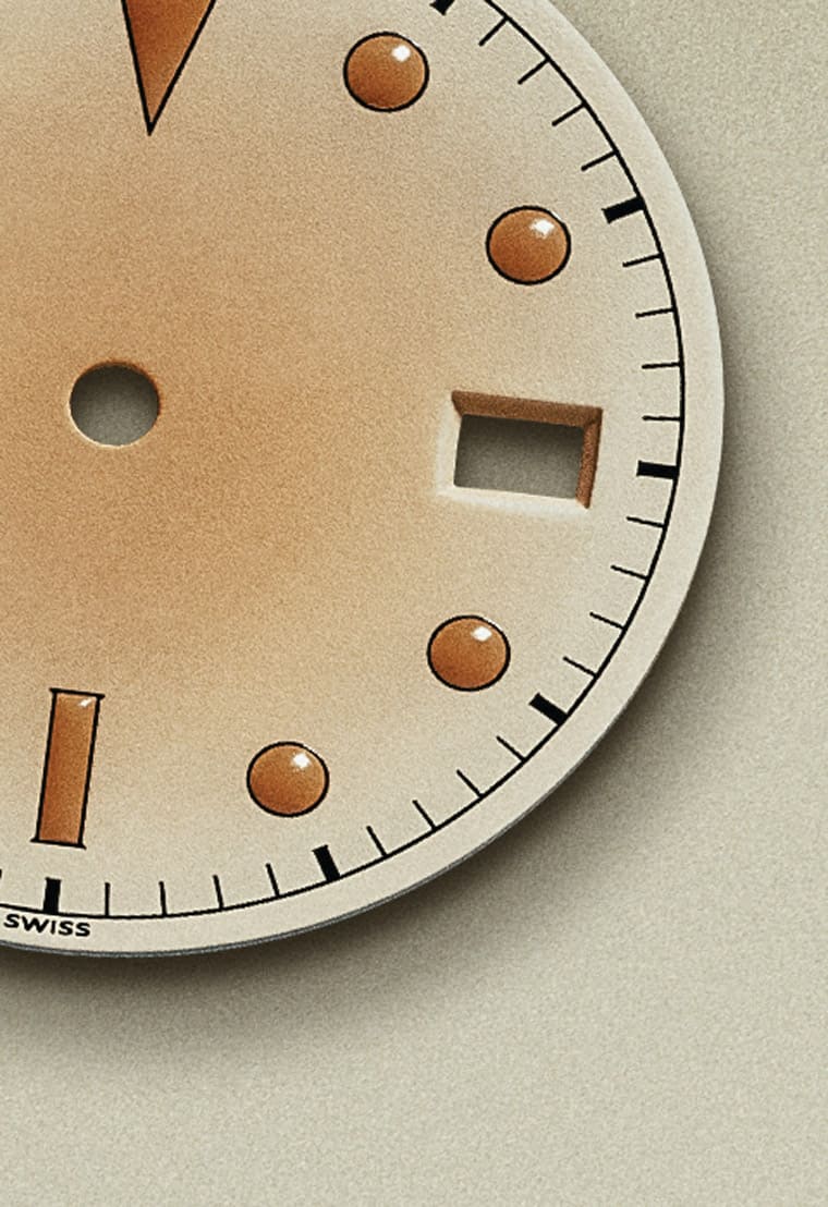 改裝錶品牌從1960年代的設計獲得啟發,將日期盤上的數字改成經典的紅藍雙色,並且把日期盤塗成了奶油色,看起來好像是自然泛黃般的歲月感。