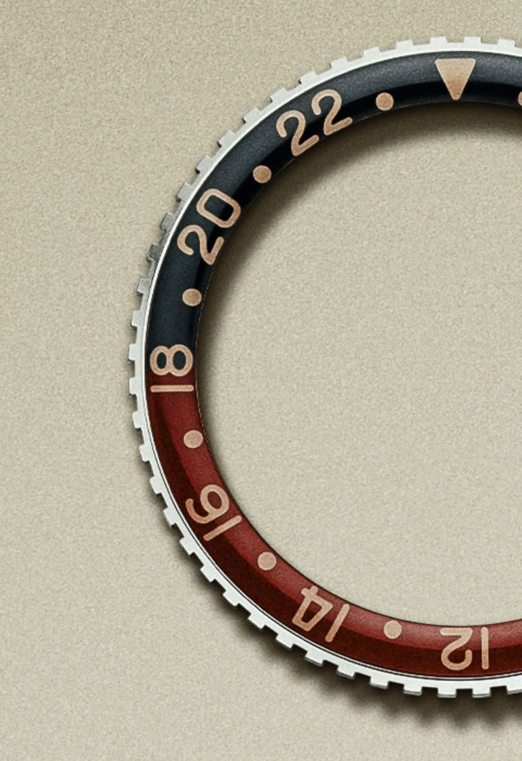 Artisans de Genève用電木材質製作紅藍雙色錶圈的嵌件,錶圈的刻度塗有夜光物料,包括錶圈邊緣的凹槽也改成了平齒式設計。