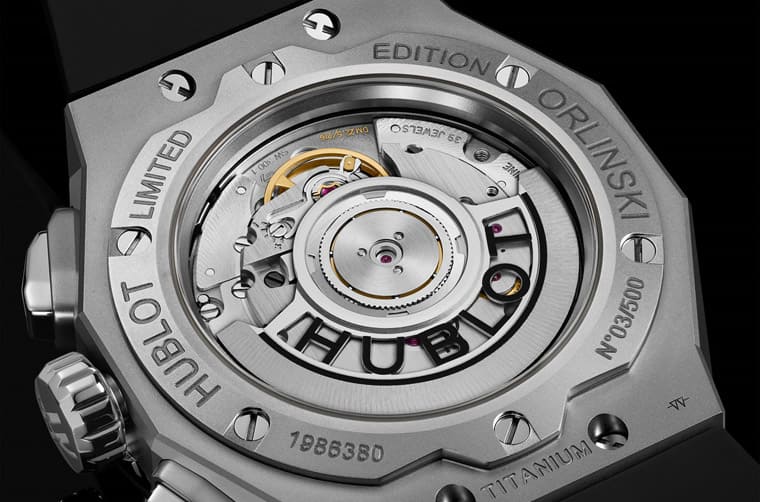 透明底蓋邊緣特別鐫刻上Orlinski之名以及限量字樣,連限量編號也同步刻上,值得注意的是,橡膠錶帶版本與鈦金屬鍊帶版本的限量數並不一致,後者的限量數比起前者減少50%,當然錶帶材質的製作成本也反映在手錶的定價,這是在入手前對於手錶要先有的基本認識。