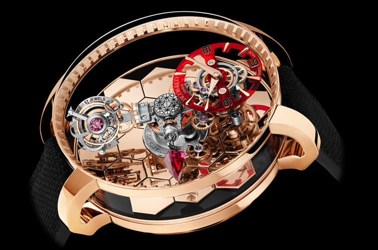 18K玫瑰金材質/JCAM48B手動上鍊機芯/偏心時、偏心分顯示/陀飛輪裝置/旋轉箭頭裝置/藍寶石水晶鏡面/防水30米/錶徑47mm/限量6只/參考價:US$ 600,000