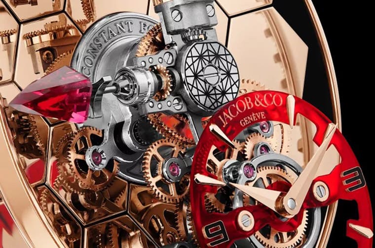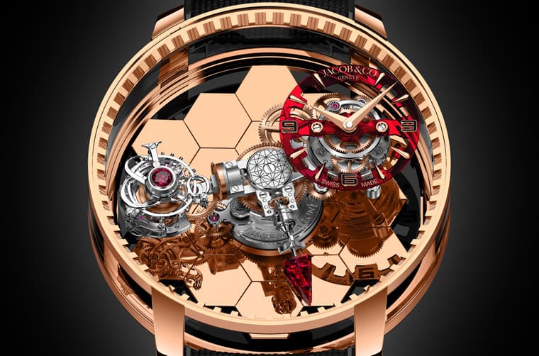 JACOB & CO.於2016年首度發表Astronomia手錶系列,手錶不僅擁有47mm大錶徑,同時錶殼側面以藍寶石水晶製作,使得面盤的機芯結構可以從上面與側面角度看得更盡興享受。最初的Astronomia手錶搭載一枚能垂直旋轉的機芯,機芯延伸出四個支臂,包括雙軸陀飛輪、以差速器連結的偏心小錶盤、一個具有228個切面用來比擬月球的鑽石,最後一個支臂則是連接一枚鎂質微型地球儀,搭配機芯的砂金石機板,名符其實地演繹天文現象般的壯觀走時畫面。