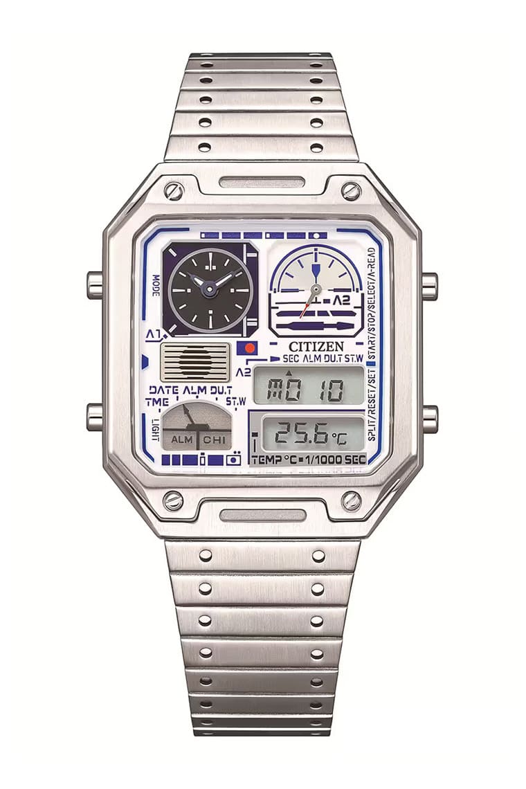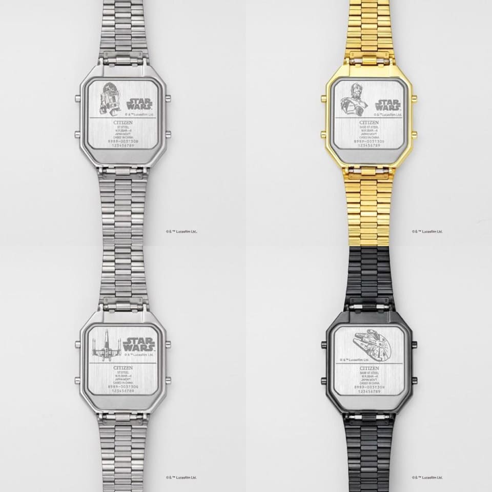 Thermo Sensor為CITIZEN 1982年打造的作品,它是史上首款具備溫度計功能的指針/數位雙顯手錶,近年品牌重新復刻這款錶後頗受市場喜愛,因此2023年的星際大戰聯名錶再度奠基於此系列,並精選出星戰電影的人氣角色如R2-D2、C-3PO、X翼戰機和千年鷹號作為手錶的創作主題。Thermo Sensor雖然是1980年代的產物,但是它的設計放到今天來看還是頗為前衛,手錶面盤繁複的顯時資訊以及分隔設計剛好給了CITIZEN寬闊的設計空間,足以將四種主題完整地放進手錶正反面。這個限量系列手錶都會有特別製作的錶盒,裡面還會附上聯名角色的卡片供錶主珍藏,以下就來一一揭曉新出的四款作品有何特色。