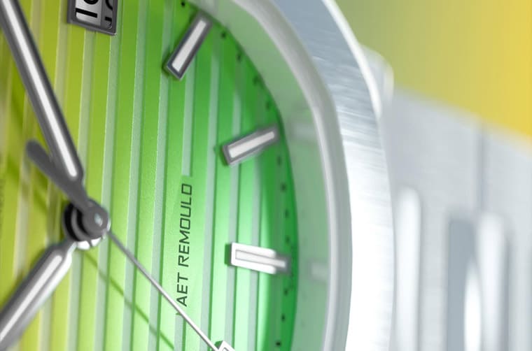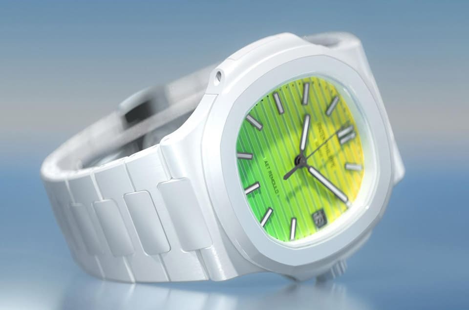▲黃綠漸層色調面盤捕捉到夏威夷日落時分的美麗畫面,搭配手錶的白色陶瓷錶殼與零件,盡展色彩的風格魅力。Source:AET REMOULD