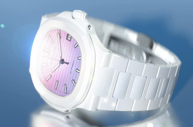 AET REMOULD最新發表的Impression Collection創作靈感來自日出與日落時天空出現的迷人景色,錶款一如Nature Collection的金鷹5711改用白色陶瓷製作;然而有別於Nature Collection是以白色陶瓷錶殼搭配白色陶瓷錶帶,這次Impression Collection更進一步地以白色陶瓷打造錶殼與鍊帶等零件,而且驚喜不止如此,Impression Collection還是AET REMOULD首度在全陶瓷錶殼作品中使用漸層色調面盤的新嘗試,所以手錶如同它的名稱,第一眼見到就讓人烙印下深深的印象。