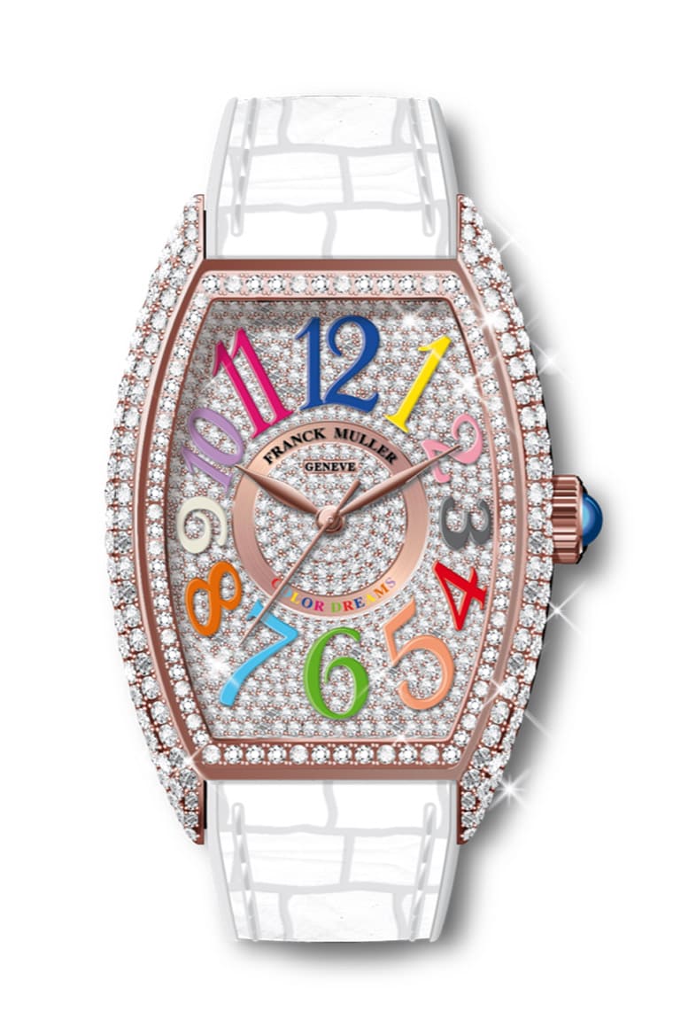 FRANCK MULLER第一次在女錶作品上結合逆跳時針功能與陀飛輪等雙重複雜工藝,從分佈於面盤上半部跨度約220度的阿拉伯數字時標佈局可知,手錶的時針在每逢12小時後便會逆跳到9點方向以避免時針長時間重疊在陀飛輪裝置表面的情況。錶款於錶殼、陀飛輪外圈及錶冠皆鑲滿鑽石,搭配彩色的阿拉伯數字時標,華麗設計很能引起女性注意。