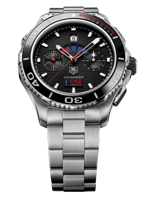 Aquaracer競潛Calibre 72 500米美國甲骨文隊限量版手錶,作為此次甲骨文船隊的官方計時合作伙伴,在爭奪站中精準計時。12點位的倒數計時功能讓隊員一目了然,精準倒數從而衛冕。該款手錶以美國甲骨文隊官方賽船的長度命名,錶盤上刻有官方“Team USA”的標識,錶殼背面刻有標誌性的AC72帆船圖案,其防水深度達500米。它由TAG Heuer豪雅和美國甲骨文隊聯合設計,採用Calibre 72機芯,並為傳奇船長Jimmy Spithill 和船隊CEO Russell Coutts先生所推薦。該款手錶擁有防刮陶瓷錶圈,橡膠包裹的按鈕以及旋入式錶冠使它能經受得住最極端的航行條件,成為最佳的帆船倒計時設備。
