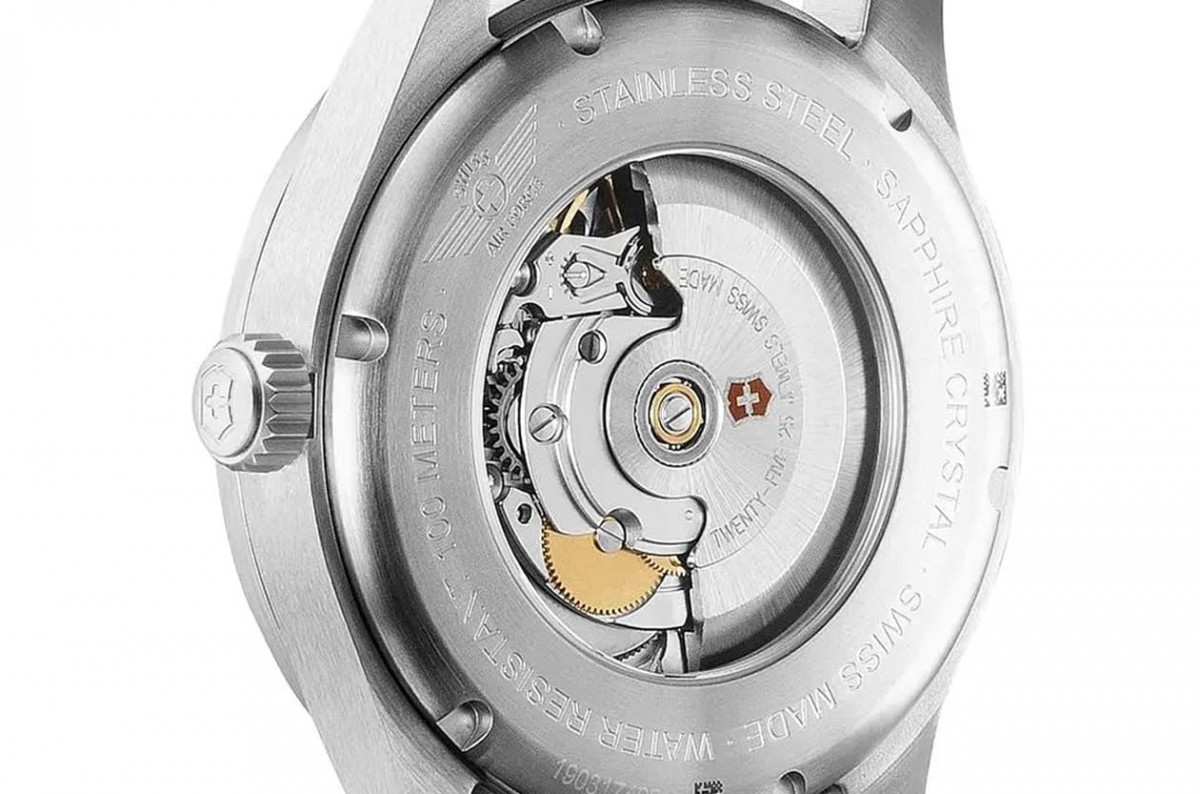 ▲錶背透明底蓋露出腕錶搭載的Sellita SW-200-1機芯,自動盤上印有VICTORINOX Logo,彰顯品牌風格之餘,也道出Airboss系列全部搭載機械機芯的重要特徵。