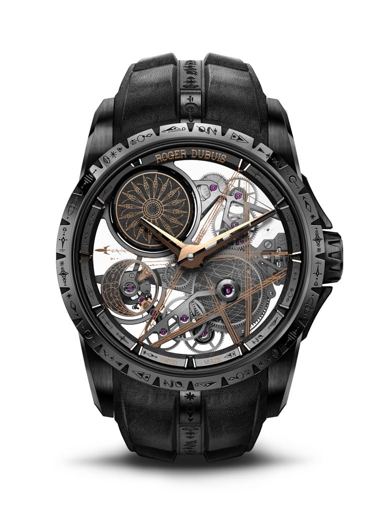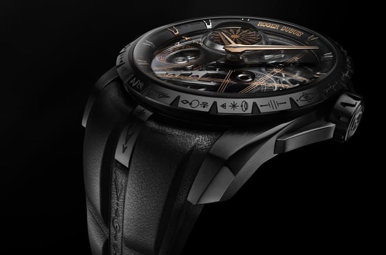 錶款採用黑色陶瓷製作錶殼,因為陶瓷硬度高、Excalibur的造型輪廓又具有繁複的雙線結構錶圈,所以在製作過程需時比用黃金製作同樣的錶殼要多花15倍時間。最終塑造出的陶瓷錶殼對佩戴者而言的吸引力也很強,包括陶瓷錶殼高度耐刮,也不會隨時間流逝而影響錶殼外觀的光澤等等。這次品牌特別在錶圈上鐫刻各種神秘的幾何符號,這一看就是Dr. Woo的個人創作特徵,包括小牛皮錶帶也刻印同樣的圖案,與其他Excalibur Monobalancier手錶呈現同中求異的況味。