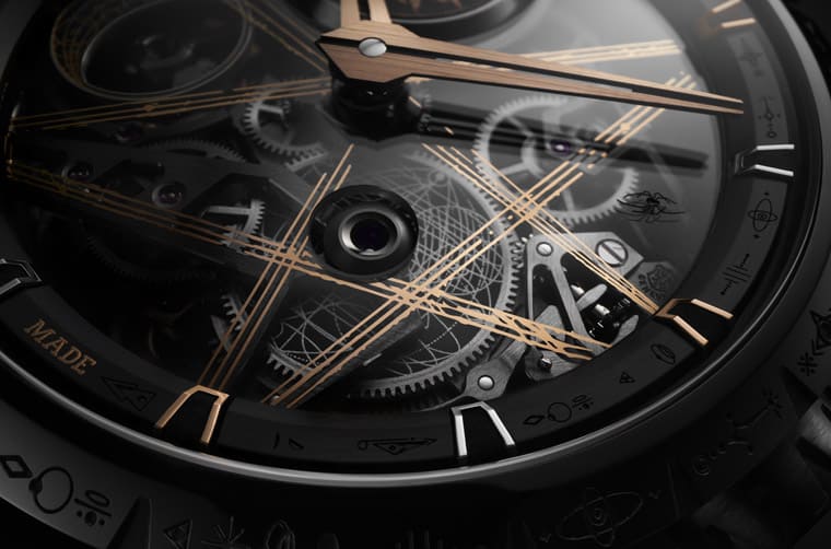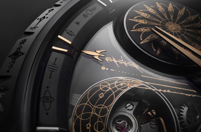 除了微型自動盤、發條盒與擒縱系統表面夾板的圖案,王者系列單擺輪腕錶Dr. Woo特別版的面盤還充滿各種花樣,例如2點和3點之間有Dr. Woo特色的隱藏蜘蛛圖案——這項設計也曾出現在其與羅杰杜彼合作的前一款手錶上。至於每款Excalibur Monobalancier手錶不可或缺的星形橋板元素在這款錶上則是改用在藍寶石水晶鏡面上刻印的方式呈現,品牌用多道金色線條畫出五芒星的輪廓,中間還穿梭著一艘小巧的立體雕刻火箭從3點方向跨越整枚面盤直到9點方向,剛好與9點位置的時標對望,這時我們會欣喜地發現再時標之間的範圍中也都還刻有各種神祕的幾何圖案,實在是有超多值得品鑑的細節。