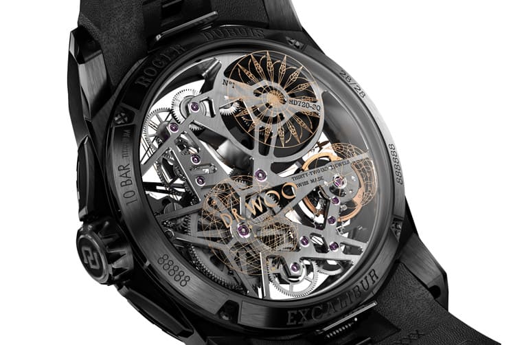 錶背透明底蓋上呼應面盤微型自動盤、發條盒與擒縱系統的夾板圖案,羅杰杜彼同樣以雷射技術鐫刻出太陽、地球和月亮的圖案與Dr. Woo的名字,下方則是RD720SQ機芯,這枚機芯經過精密調節的擺輪慣性可以提高穩定性並降低手錶遭受撞擊時可能產生的影響,同時它的矽質擒縱輪和擒縱叉均覆以金剛石塗層以提升耐用性,並能發揮抗磁效用。機芯動力儲存多達72小時,日常佩戴相當足夠,同時它的機芯零件作工與走時精準度等,也都有日內瓦印記把關展現優於多數手錶的能耐。