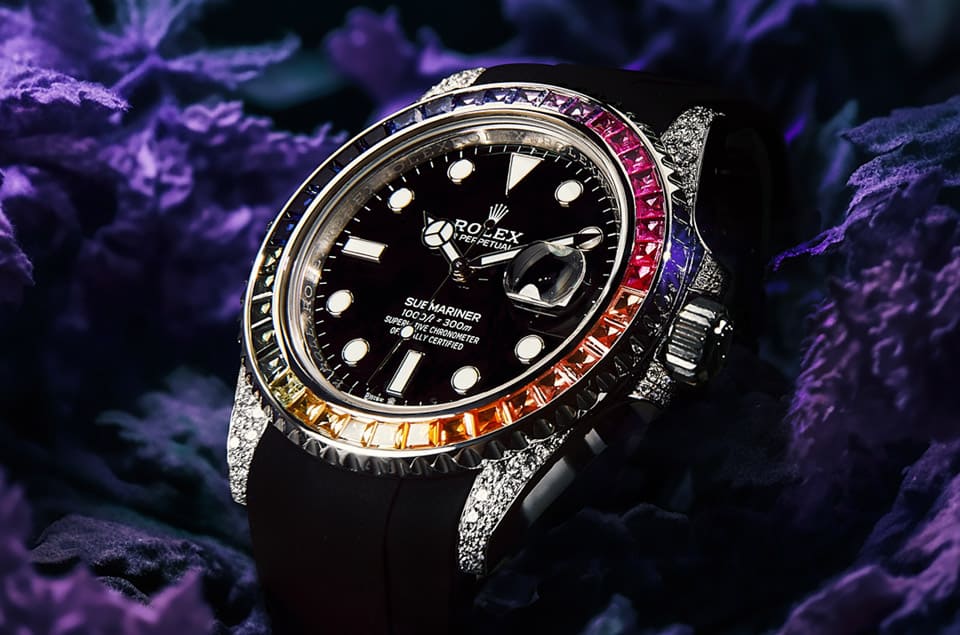 除了有能力還原原廠設計的珠寶鑲嵌款式,CAGAU也會自行開發前所未見的珠寶設計,例如他們有一款黑水鬼就別開生面地採用了鑽石圈設計,原本的陶瓷錶圈變成了由各色寶石組成的彩色漸層設計,並在錶耳和錶冠護肩鑲上了許多鑽石,至於面盤則是維持原本的設計,CAGAU主要是在錶殼外觀鑲嵌寶石,但這樣就足以讓手錶看起來大不同了!