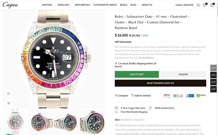 彩虹圈黑水鬼的基礎是126610LN,目前它在二級市場的價格還是有4、50萬台幣的水準,你可能會先入為主覺得把黑水鬼鑲上鑽石與彩色寶石後,價格肯定翻幾番,也許會突破百萬台幣也不意外,但是根據CAGAU網站顯示的價格,這款錶後鑲寶石後的價格為26,000美金(約合台幣80萬多),想不到比預想中的要親切一些,比起我們常看到其他改裝錶品牌動輒百萬的改裝價碼,CAGAU的珠寶鑲嵌改裝設計竟意外的沒有超級昂貴,在紙醉金迷的杜拜境內,對於手錶收藏家而言這樣的定價策略感覺很有吸引力。而CAGAU的勞力士後鑲手錶其實還有許多來自各系列的作品,喜歡手錶有珠寶元素點綴的玩家們,未來應該會愈來愈常聽說這個新興品牌,因為他們正在用自己的實力在全球建立知名度。