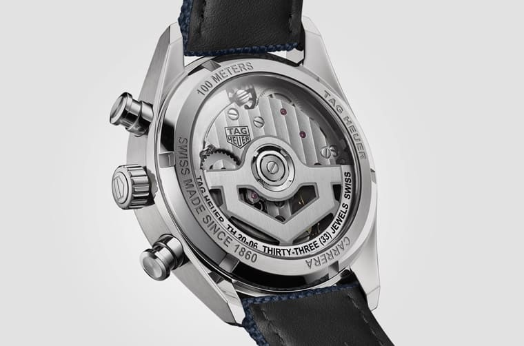 錶款透明底蓋露出雙向自動上鍊計時機芯TH20-06,其具有80小時動力儲存,鏤空自動盤含有泰格豪雅盾牌型的造型概念,防水性能達100米從事帆船運動綽綽有餘。而泰格豪雅也精心替手錶搭配高品質耐用編織錶帶,在夏天容易流汗的時節,這種錶帶不會讓人覺得佩戴不舒服,更有利於展現手錶的運動本色。