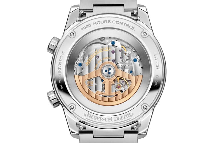 錶款搭載的868AA機芯擁有鏤空玫瑰金自動盤,在透明底蓋下可以看得清楚。這枚機芯在2013年首度推出,後來經過積家重新優化與改良,除了增添逆跳南半球月相顯示,動力儲存也拉高至70小時,而且它的結構經過精密設計可以主動辨識大小月以及閏月,在手錶持續運作的狀態下,要到2100年才需要手動調效一天誤差,而積家也為了讓錶主更安心佩戴這種高階複雜功能作品,因此在面盤接近中央指針軸心的地方特別設置了安全調時顯示視窗,每當時間走到20時至隔日4時,此視窗會出現橘色的色塊(其他時間則是白色),提醒錶主不要在此時操作下方錶冠調校時間(上方錶冠是用來操作旋轉內錶圈),相當貼心;附帶一提,萬年曆功能只要透過單一錶冠就能調校,簡潔設計也是這款錶會讓人愛不釋手的一項關鍵。