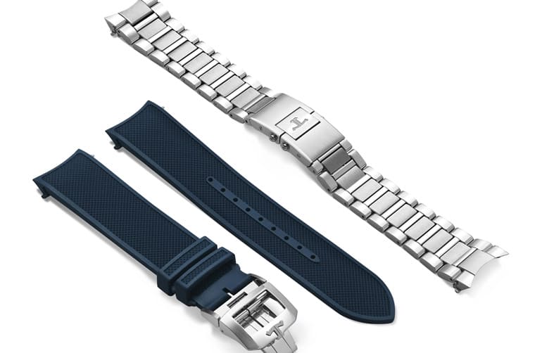 ▲除了不鏽鋼鍊帶之外,手錶還會額外附上一條深藍色橡膠錶帶,搭配手錶具備的錶帶快拆系統,錶主可以輕鬆自行更換錶帶。