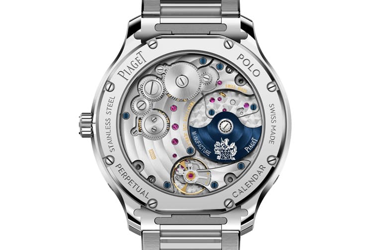 Polo超薄萬年曆分別於3點、9點與12點方向設置小錶盤呈現各種日曆資訊,三者依序為日期顯示、星期顯示、月份/閏年顯示,加上6點方向的圓形視窗簡約月相顯示,佩戴者因而能夠一目了然詳盡的大小時間單位。展示出豐富的時間資訊之餘,錶款搭載的精密機芯能使手錶在持續運作的情況下,一直到2100年才需調校一次萬年曆功能,精準的設定大大超越一般日曆功能機械錶所能達到的境界。錶款的品牌Logo因應萬年曆需增設小錶盤而改換到6點方向,這與Polo大三針和計時款式都是將Logo設置在12點方向不一致,而且Polo超薄萬年曆的品牌標誌上也還印上弧形的Perpetual Calendar字樣,讓人一眼就能意會手錶搭載日曆功能中最頂級的結構。
