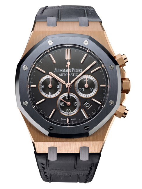 全球限量發行400枚,專為AP品牌大使足球金童「梅西」量身打造的限量錶款,18K玫瑰金錶殼搭配散發低調藍灰光芒的鉭金錶圈。優雅而簡潔的錶盤並未沿用皇家橡樹系列標誌性的「Tapisserie」格紋圖案,而是採用垂直拉絲打磨處理的深灰色錶盤,搭配玫瑰金時標。計時盤和小秒盤的外圍則以細緻的環形拉絲打磨處理的銀環裝飾。