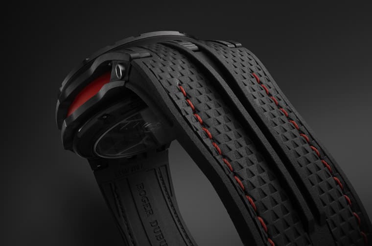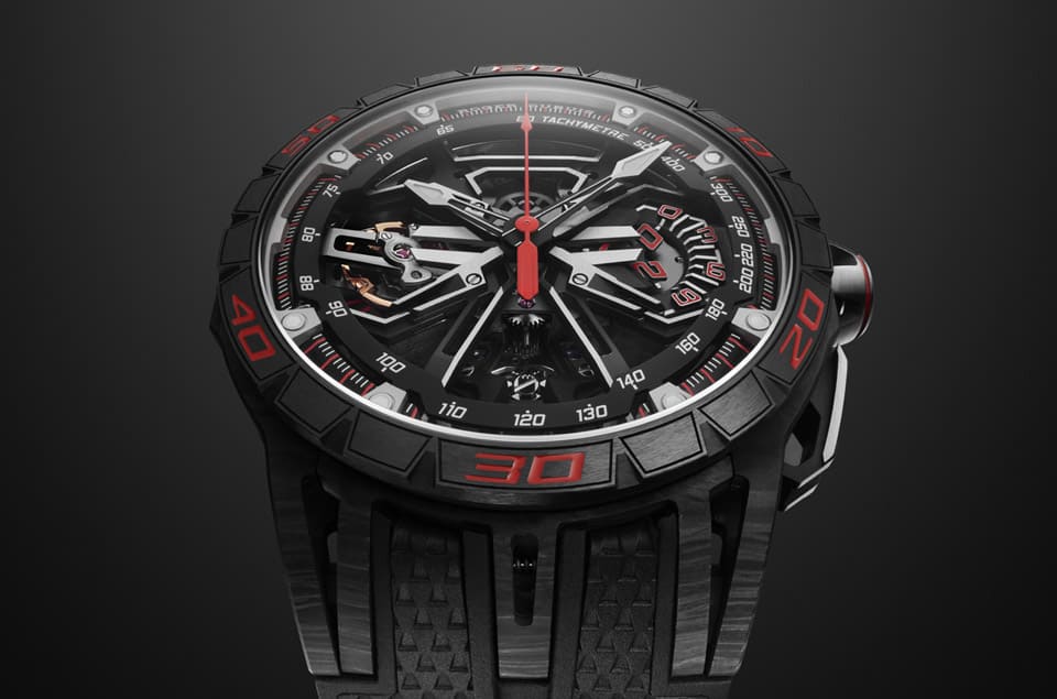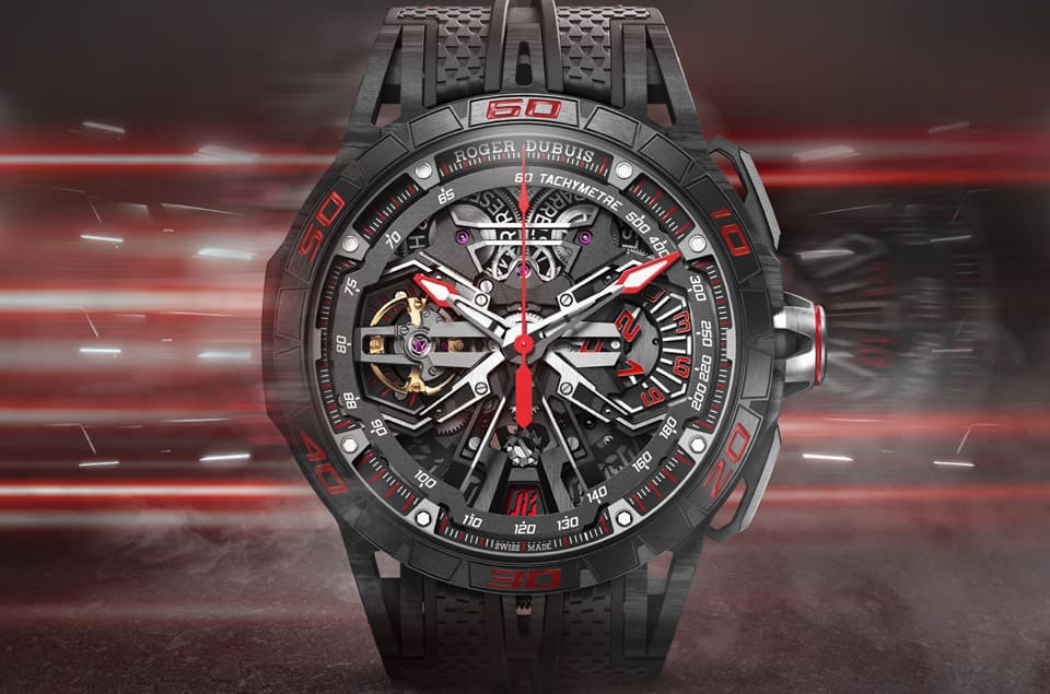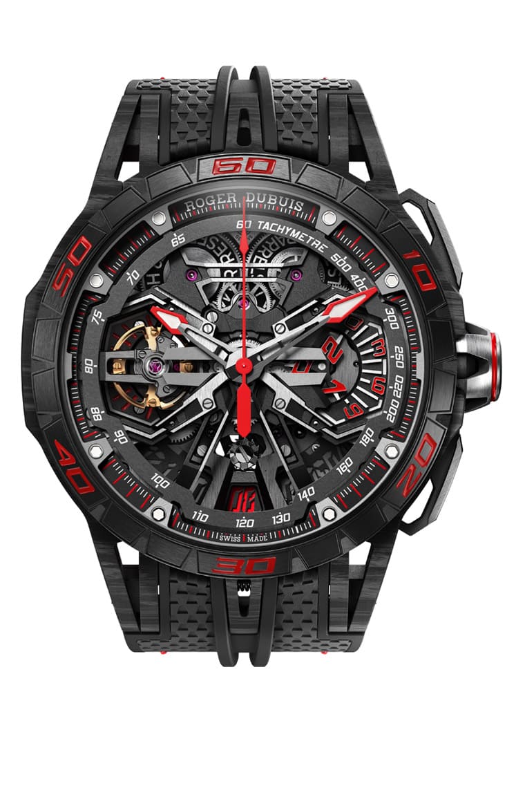 羅杰杜彼甫在2023年的日內瓦鐘錶與奇蹟錶展上發佈Monovortex™ Split-Seconds Chronograph追針計時碼錶這款蘊含陀飛輪以及追針功能的頂級計時碼錶,Excalibur Spider Flyback Chronograph身上既有著沿用錶展上那款高階計時碼錶的部分技術,同時也含有向古德伍德速度節致敬的深意,因此手錶融入不少賽車元素,展現羅杰杜彼對於賽車運動的熱愛與深入研究。