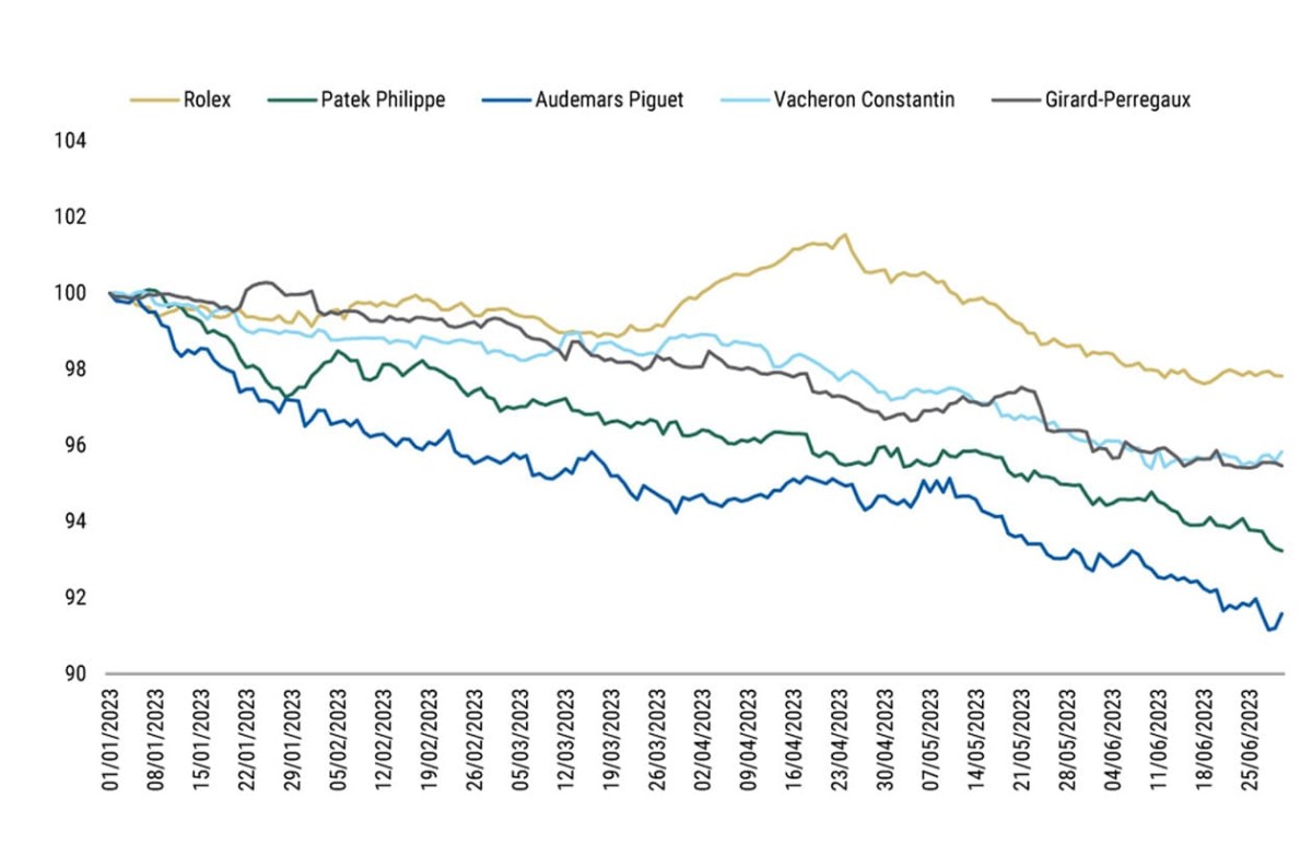 ▲從大摩和WatchCharts提出的報告中可見,包括勞力士、AP和PP在內等大品牌熱門錶,2023年迄今的行情整體都還在往下降,只有勞力士在3~4月時一度短暫成長,不過從4月底開始後又持續下滑。Source:Morgan Stanley、WatchCharts