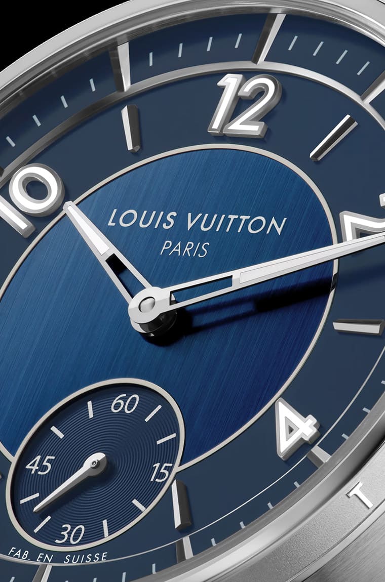 Tambour的金色指針採錐形和刻面鏤空造型,為錶盤增添空間感,跟時標一樣都有塗上Super-LumiNova夜光塗層,有利在光線不足時讀取時間。12點下方中心可見LOUIS VUITTON PARIS 字樣,展現品牌在 1854年起源於巴黎的出身。6點方向的蝸形小秒盤,下方寫上法文的「瑞士製造」FAB. EN SUISSE,而不用英文SWISS MADE,以此微小變化暗示路易威登在日內瓦的製錶工廠的高級製錶史,也成為強調2023新作重要變革的線索。