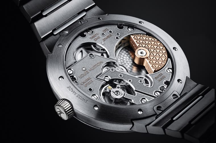 ▲作工細緻、動力儲存達50小時的路易威登自動上鍊機芯LFT023,透過透明底蓋還可以看到22K玫瑰金微型自動盤的精美設計以及運作動態。
