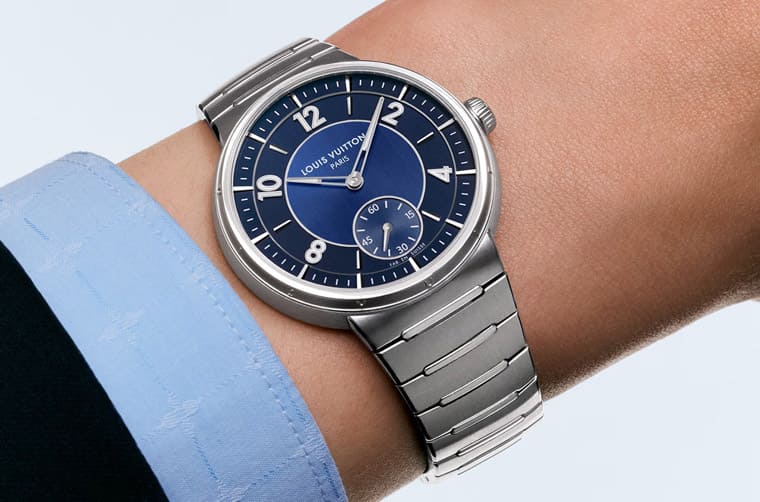 融合巴黎時代風尚與瑞士製錶技術的Tambour不鏽鋼自動小三針腕錶,直徑40mm、厚度8.3 mm,整體以拉絲飾面裝飾圓形錶殼,噴砂錶圈加上拋光邊緣增加層次。錶殼側面也就是最重要的弧形側面,在與小時標記對齊處,刻上LOUIS VUITTON品牌12個字母,在清晰精準之餘,表現了Tambour腕錶系列不敗的中性設計。不僅如此,此錶還有另一個首創,是路易威登第一款採用整合式錶帶的腕錶,與整體採用拉絲飾面的錶殼相同,也使用拉絲不鏽鋼錶鍊,事實上是以多個拉絲鍊節組成,彷彿一體成型,而且鍊帶鍊節的上下表面均為凸面,形成連貫的圓形線條更能緊密舒適地貼合整個手腕。鍊節末端刻有 LOUIS VUITTON 字樣,並搭配三片式折疊扣的隱藏式開口,極其簡約。加上無錶帶頭的結構,錶鍊與錶殼更是無縫融合,加強堅固性和靈活性的佩戴感受。