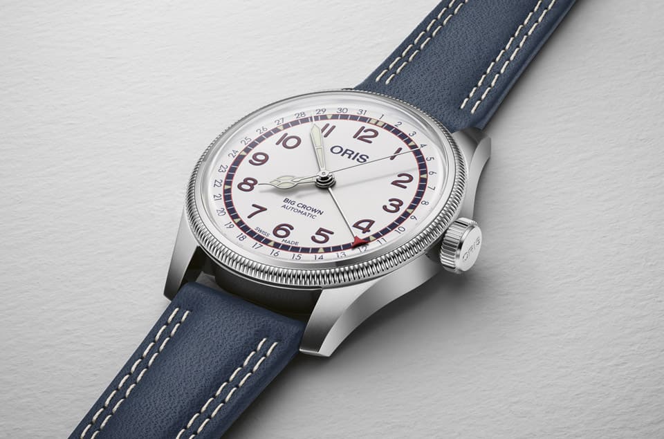 ▲手錶的造型與面盤格局都與一般的Big Crown指針式日期手錶無異,不過ORIS參考了漢克阿倫母隊勇士隊的配色,將藍、紅和白色三色融入手錶細節。