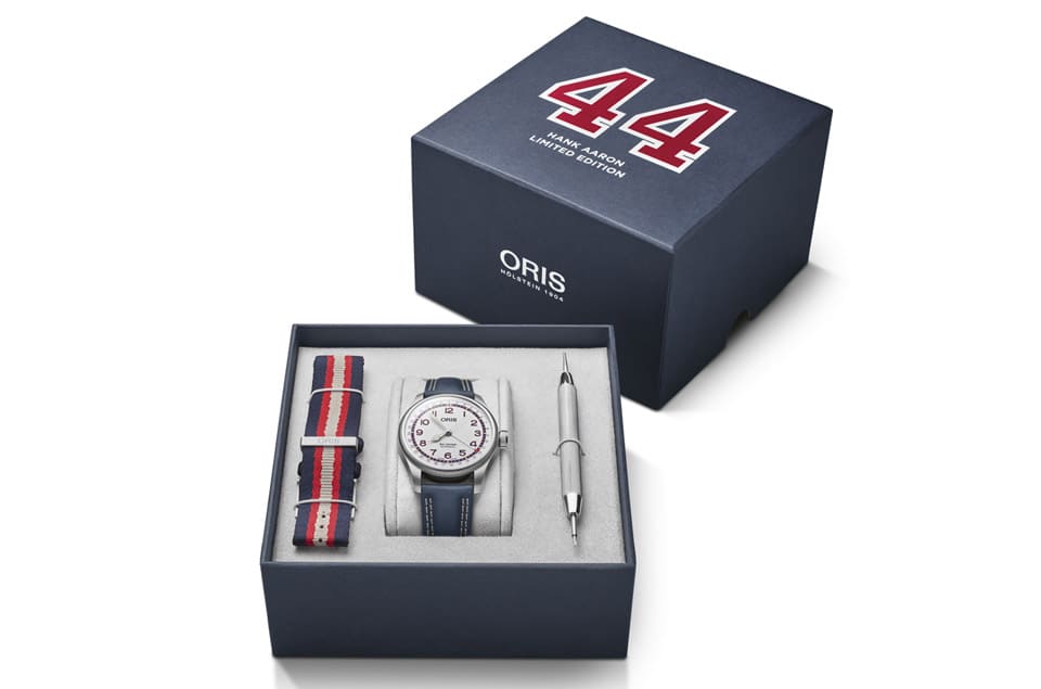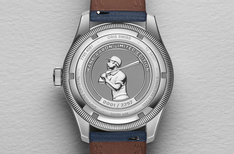 Hank Aaron限量錶和品牌先前創作的Roberto Clemente限量錶似曾相識,ORIS同樣以Big Crown指針式日期手錶當做設計基礎,並以不鏽鋼材質製作錶殼,不過Hank Aaron限量錶換上了藍色皮革錶帶,錶帶兩側也同樣以呼應棒球縫線的雙縫線設計加以固定。