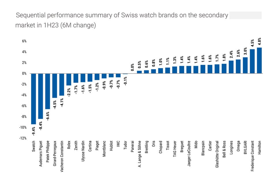 ▲WatchCharts所公佈知名品牌熱門錶在2023年上半年的平均價格變化。Source:WatchCharts